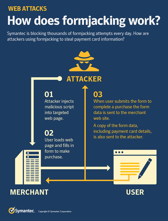 "Formjacking" is a type of cyber attack, by which hackers add malicious codes to a retailer's website. By using this virtual ATM skimming technique, hackers are enabled to steal online customers’ payment details that include sensitive card information.