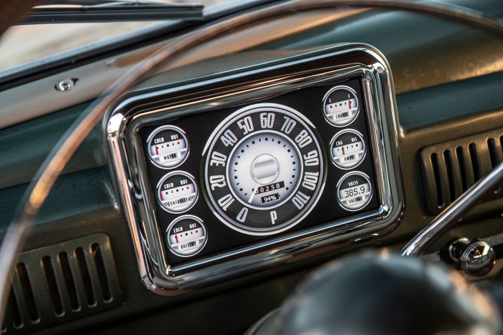The classical engine enclosure was recreated and without the engine, of course. Instead, they put battery controllers as well as some Tesla modules under the enclosure. Besides, it was supplemented with an electric AC.