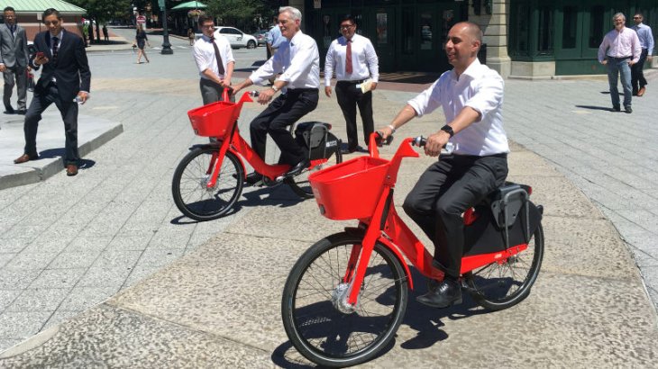 Mayor Jorge Elorza (on the right) is riding a Jump bike with Tom Croswell (CEO of Tufts Health Plan) in Providence, Rhode Island in July 2018.