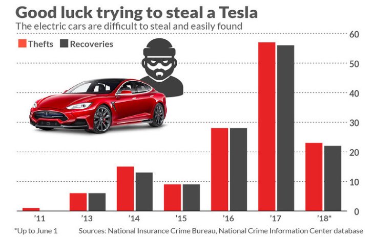 The following chart illustrates that almost every stolen Tesla vehicle is recovered; though not 100% but quite close.
